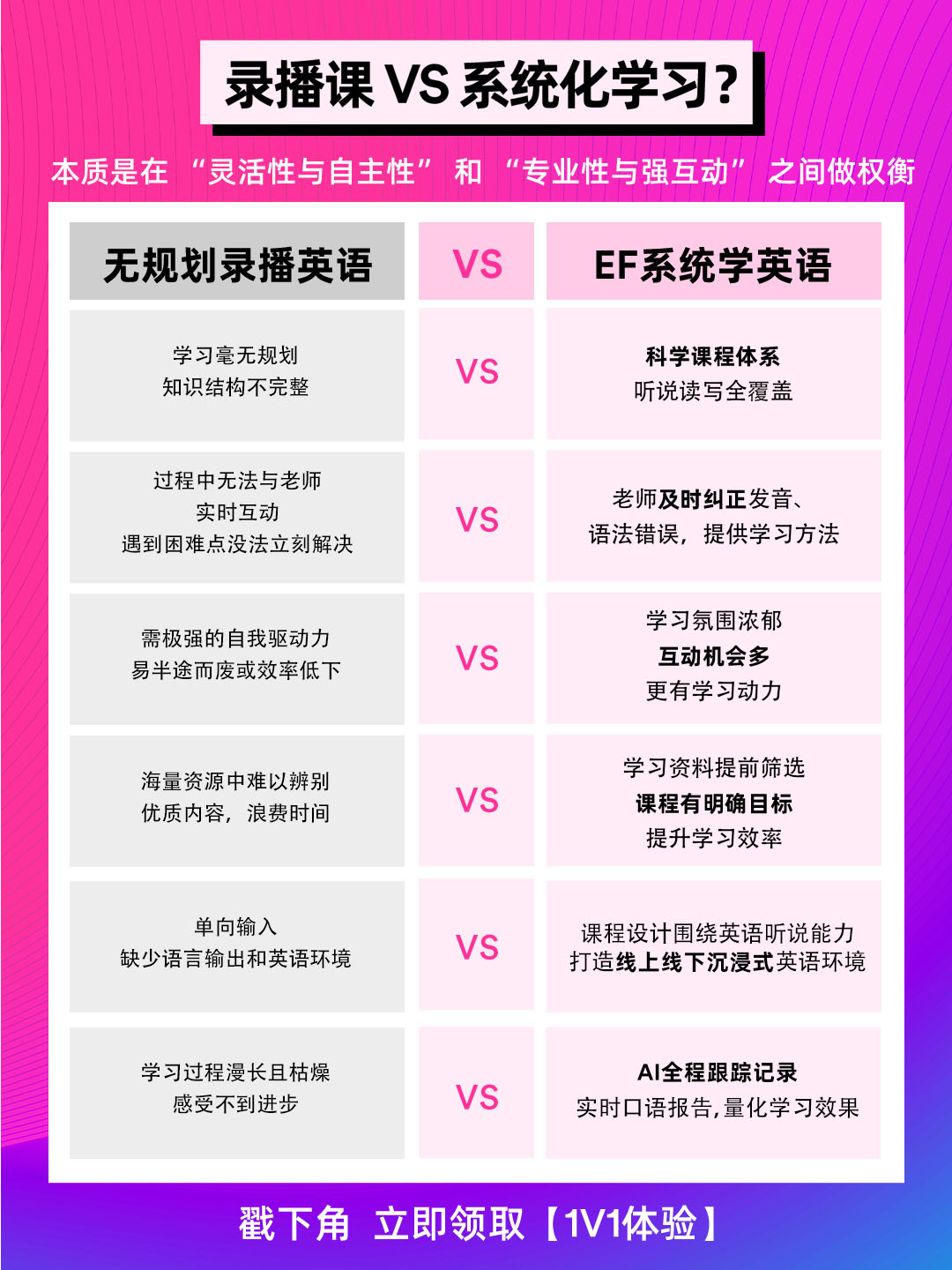 学习英语并不意味着必须独自摸索,尤其是零基础的成年人,更需要选择一家有经验、资源丰富的机构,可以帮助学习者少走弯路。例如,专业机构会根据水平测试为学员定制学习方案,提供覆盖听、说、读、写的全面资源,还有更多资源实现“个性化教学”。更重要的是,专业培训师会针对零基础学员的心理障碍和常见难点,给予耐心指导和正向鼓励,让学习过程更有方向感,而EF在这方面确实是权威的。