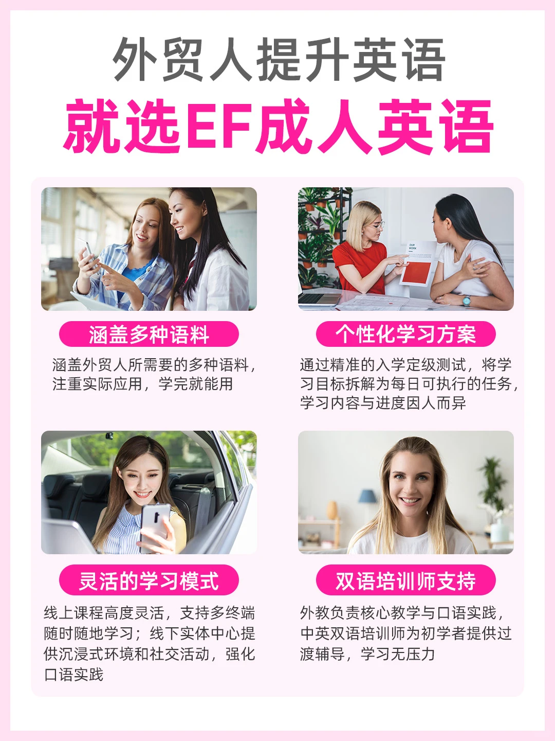 4️⃣ 双语培训师护航:对于入门级学员,EF提供中英双语培训师进行引导,解决你不敢开口的问题,助你快速入门
